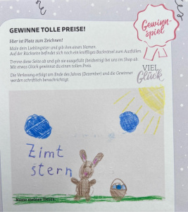 In der Backwelt gibt es ein Rätselheft für alle kleinen Gäste. Darin ist Platz für ganz große Kunstwerke. Unter allen abgegebenen Zeichnungen haben wir einen Gewinner gezogen: Es ist Clara mit ihrem Zimtstern! Schon bald darf sie sich über Post von mir freuen.