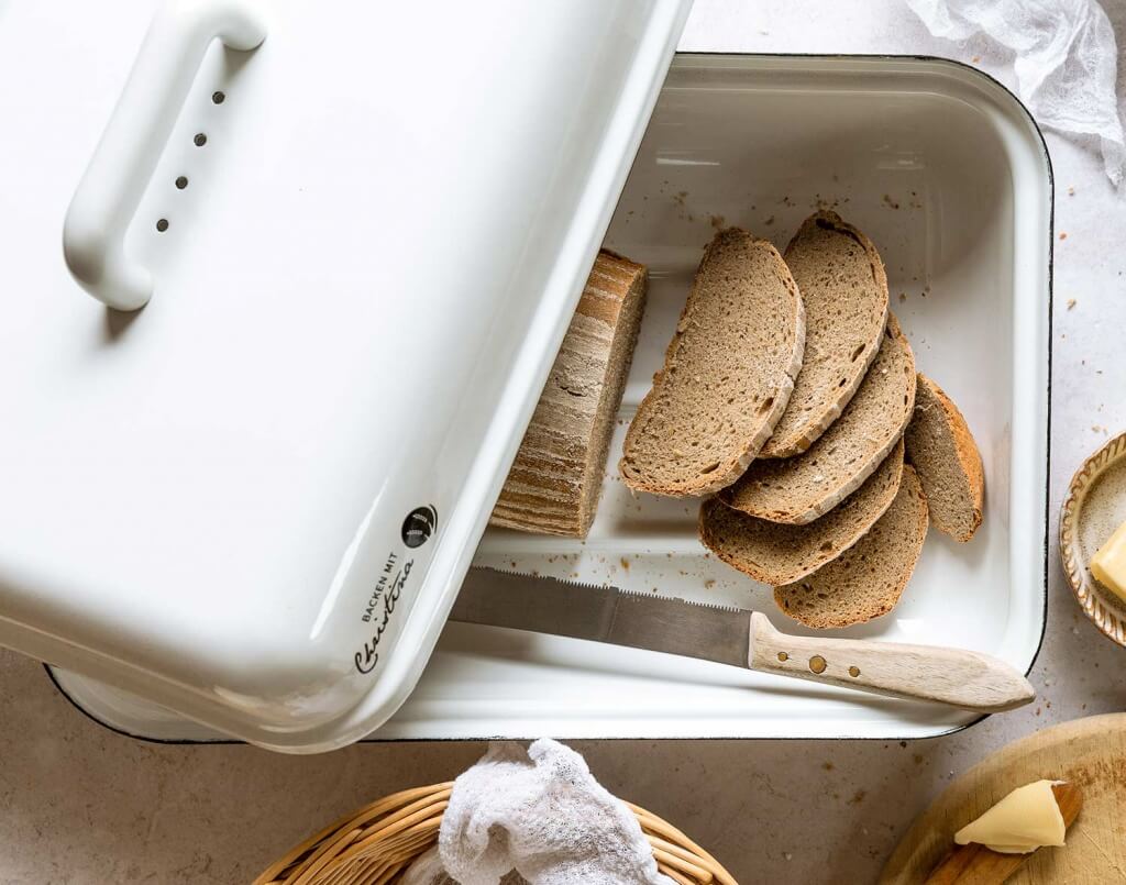 Diese große Emaille-Brotdose hält Brot, Gebäck und Brötchen geschmacksneutral frisch. Ein ganzer Brotlaib oder ein Vorrat an Frühstücksbrötchen finden hier ganz leicht Platz.