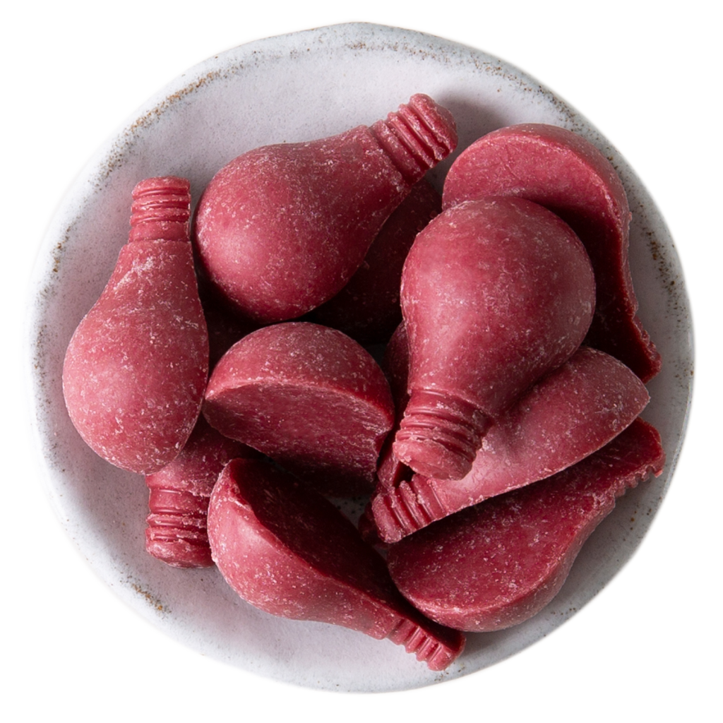 - Die Kuvertüre hat die Form von kleinen Glühbirnchen (Glühbirnenhälften).