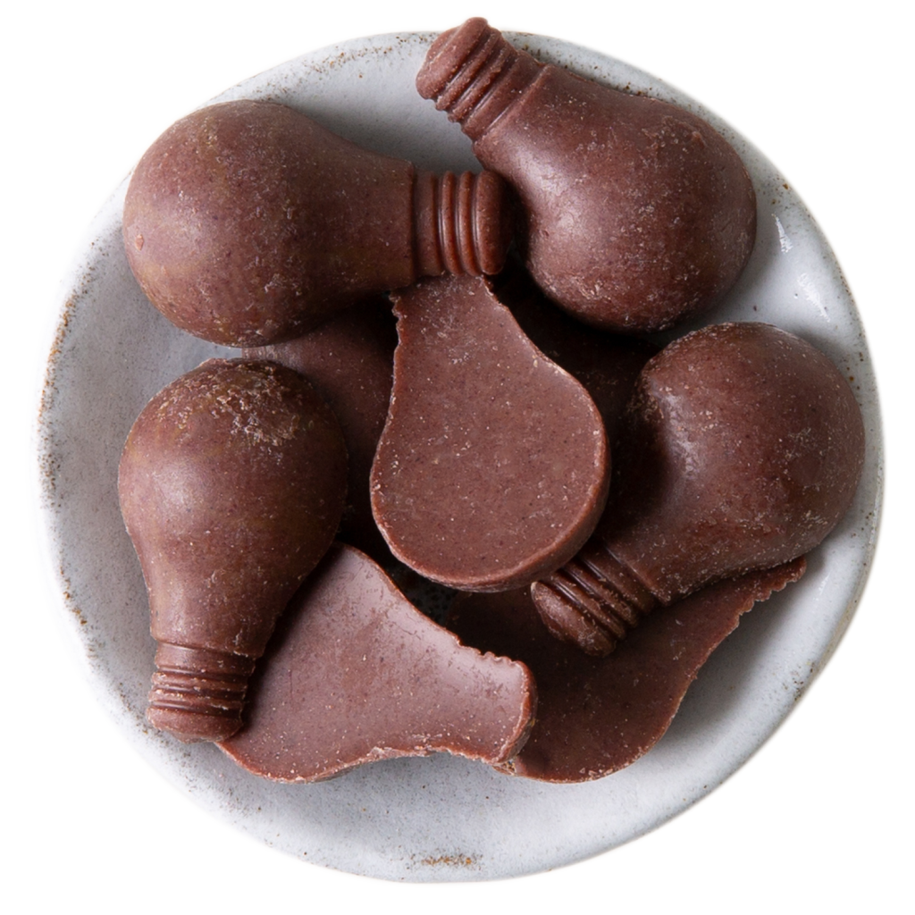 - Die Kuvertüre hat die Form von kleinen Glühbirnchen (Glühbirnenhälften).