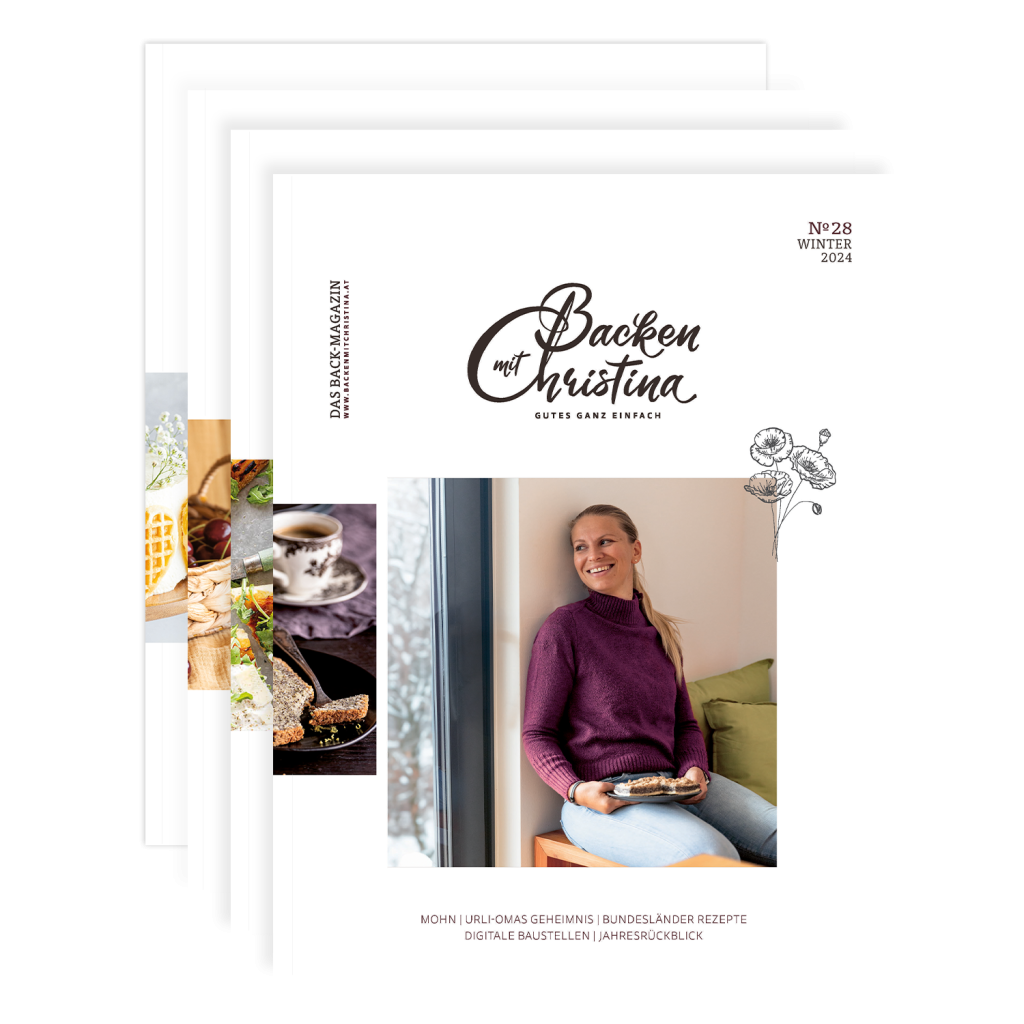 4 Magazine mit über 60 Seiten vollgefüllt mit Rezepten, Geschichten und Tipps & Tricks rund ums Backen