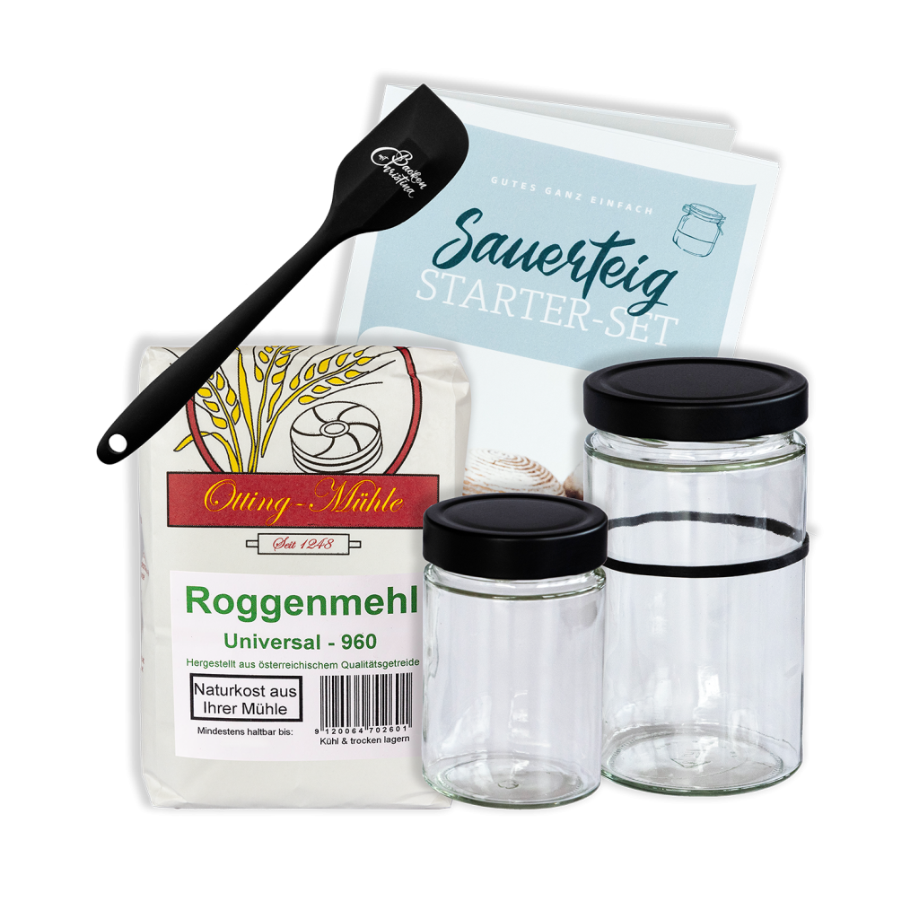 - 1 Schraubglas (720 ml) mit Deckel und Gummiband – ideal zum Füttern des Sauerteigs und Wachstumsbeobachtung