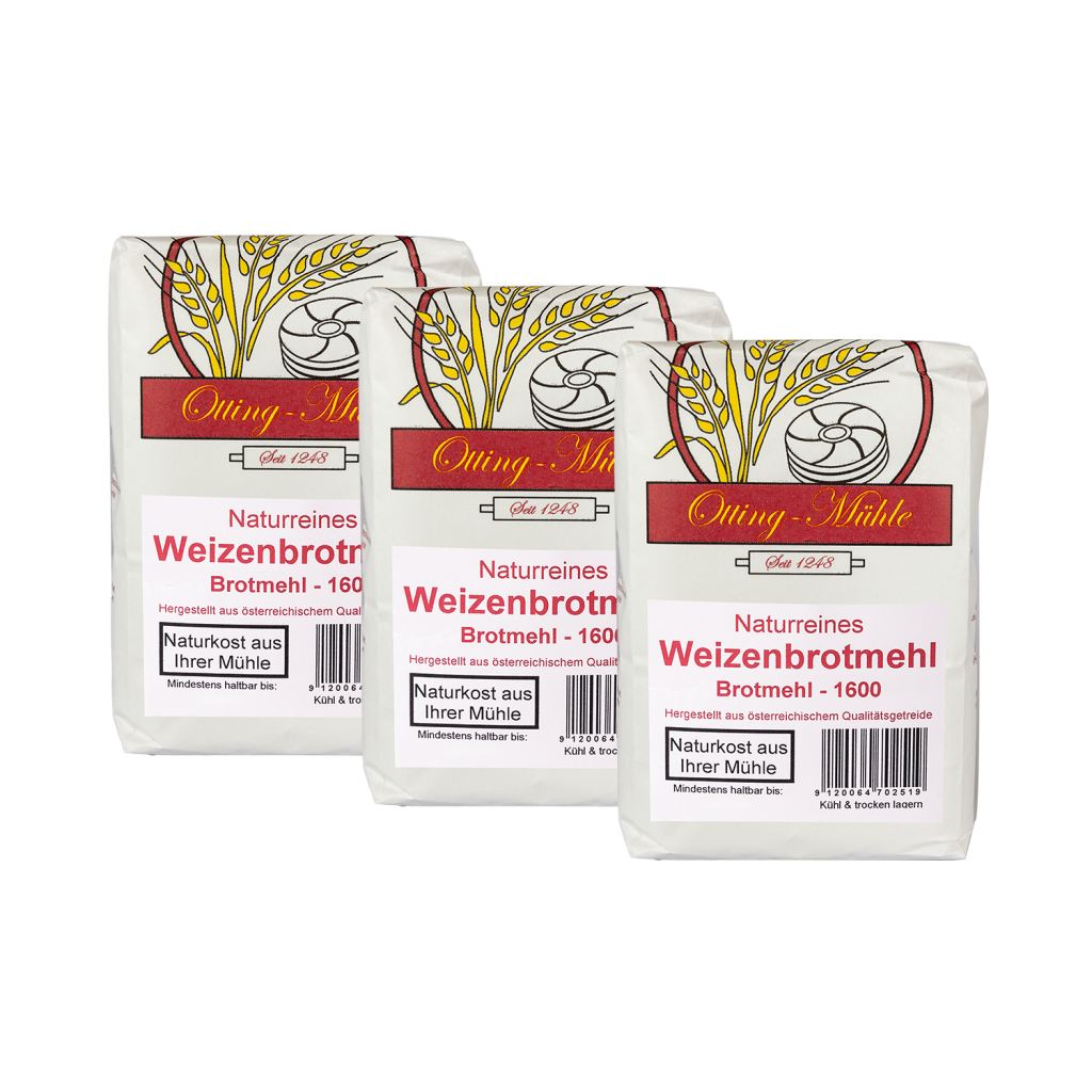 • Mehlpaket mit 3 x 1 kg Weizenbrotmehl 1600