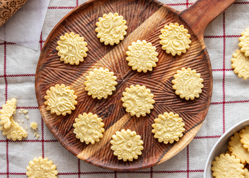 4. Den Teig in zwei Teile aufteilen und jeden dünn und rechteckig ausrollen. Einen Teil mit Mandel- und einen mit Mohnfülle bestreichen und einrollen. Danach mit einem Teigabstecher, einem Messer oder mit einer Zahnseide Stücke abstechen.